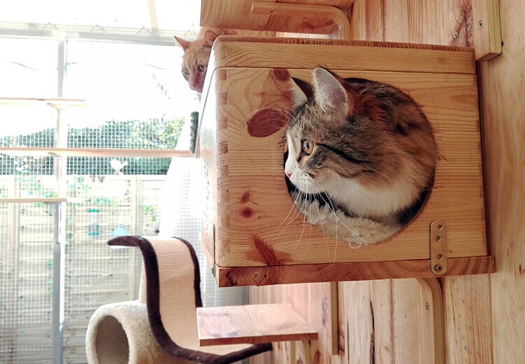 Este espacio exclusivo cuenta con múltiples niveles, rascadores, juguetes y cómodos rincones elevados donde los gatos pueden descansar, observar y sentirse seguros y protegidos.